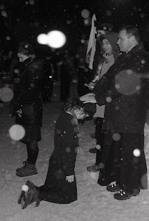 nadeszła chwila wyjątkowa dla naszej Drużyny - mianowanie Drużynowej Izy, oraz inne mianowania w środowisku. Nasza jednostka miała wreszcie oficjalnego Szefa! :) Na zdjęciu - druhna Iza przyjmuje błogosławieństwo od duszpasterza, księdza Piotra, przed obrzędem nadania jej 'tytułu Drużynowej'. Funkcję przybocznej oficjalnie już przejęła druhna Martyna.